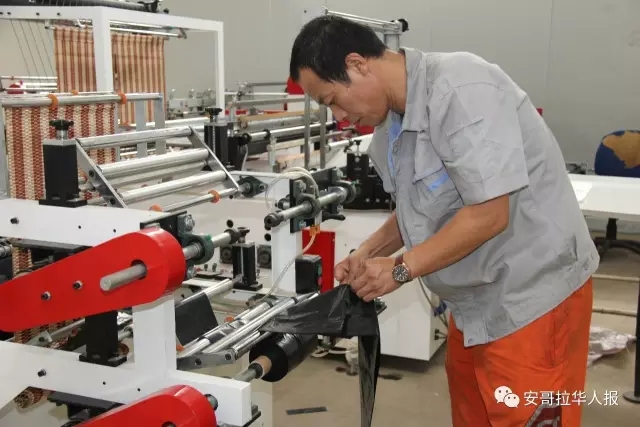 Um técnico chinês inspeciona os sacos plásticos concebidos na linha de produ??o.